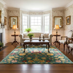 With its elaborate yellow flower designs growing over a rich green background, the Golden Blossom Persian Hand Tufted Rug is a classy way to decorate your home. This rug combines traditional style with modern charm, drawing from the timeless art of Persia. Each tuft is a work of skilled workmanship, and the rug feels luxurious and soft underfoot. Great for making your room feel warmer and more elegant.
