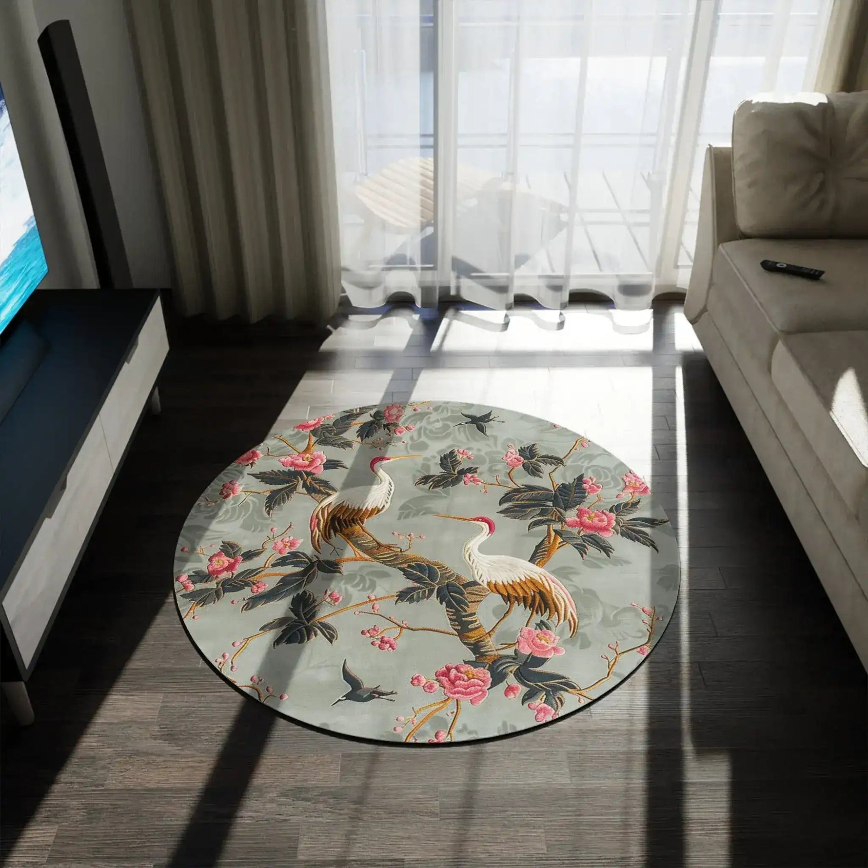Graceful Crane and Blossom Pattern Round Rug