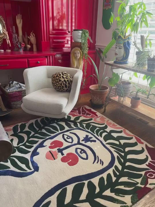 You can find art and style together in the Graceful Visage Hand Tufted Rug. Folk art has a lot of different textures, and this beautiful piece has a modern twist to it. It shows the face of a pretty woman covered in bright flowers and lush leaves. Each tuft tells a story of strength and grace, capturing the spirit of beauty that will always be in style. This rug draws attention to itself and shows off your high-class style. It gives any room a bit of class.