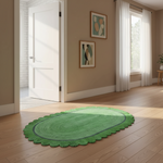 Top view of a beautifully crafted Green Scalloped Oval Jute Rug, perfect as a large area rug for bedrooms. Its boho design adds a touch of elegance and style, making it an ideal choice for bedroom rugs.