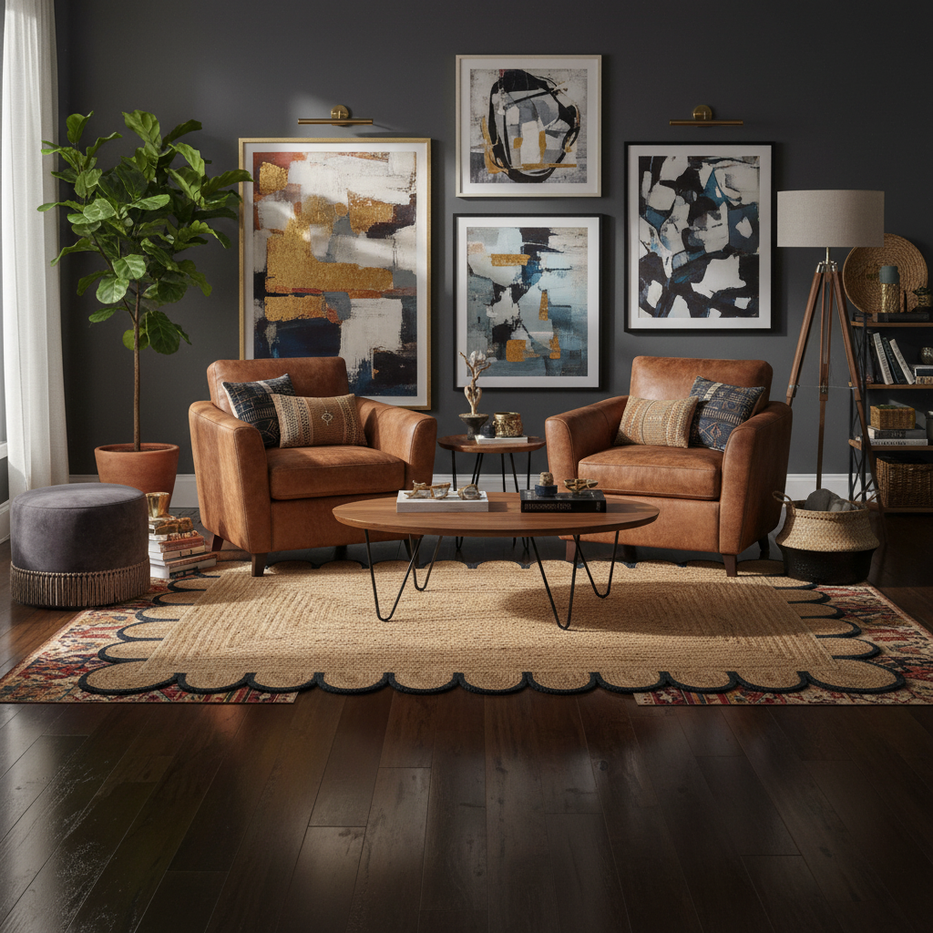 Top view of a handmade black trim scalloped jute rug, perfect for enhancing the aesthetics of living room and dining room spaces. This area rug features a natural jute texture with a unique scalloped edge, ideal for adding a touch of elegance to any living room or dining area.