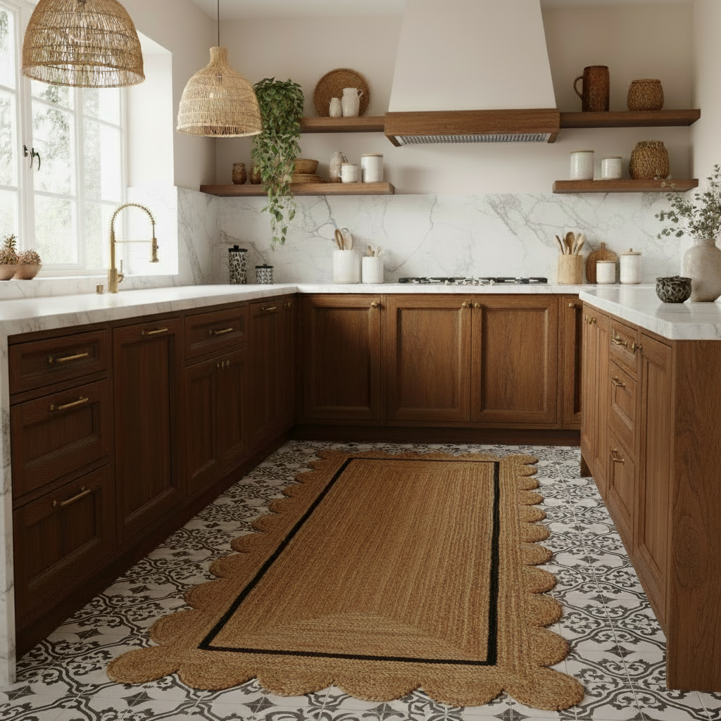 Charming handmade jute rug featuring a scalloped border with a black trim, perfect as an area rug for kitchens, hallways, or living rooms. This elegant design adds a touch of sophistication to any space, whether used as a hallway runner rug or a large living room rug.