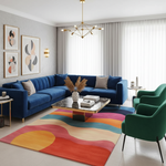 The Horizon Glow Hand Tufted Rug lets you enjoy the beauty of a sun-drenched horizon. The bright colors in this beautiful piece are abstract and were inspired by the colors of a beautiful sunset. The rug is made by hand from high-quality materials and is very durable, soft, and feels great underfoot.