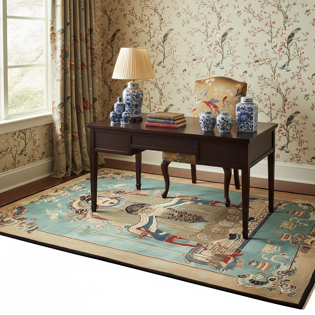 This hand-tufted rug is an ode to timeless royalty and gives off an air of grandeur and power. The ruler, who is sitting and wearing heavy traditional robes, makes an impression with his royal stance and fine details. This piece is a gateway to old dynastic grace, filled with celestial patterns and symbolic elements. It's perfect for art lovers who like how tradition and power are woven into works of art.
