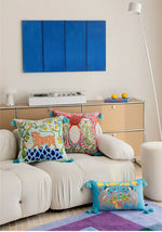Bring a touch of exotic chinoiserie to your decor with this beautiful Luxe Leaping Tiger & Lemon Tree Pillow Cover at Maia Homes. It features a detailed illustration of a majestic, stylized tiger leaping among branches of a flowering lemon tree. The intricate floral design and mythical creature combine to create a statement piece that is both whimsical and sophisticated.