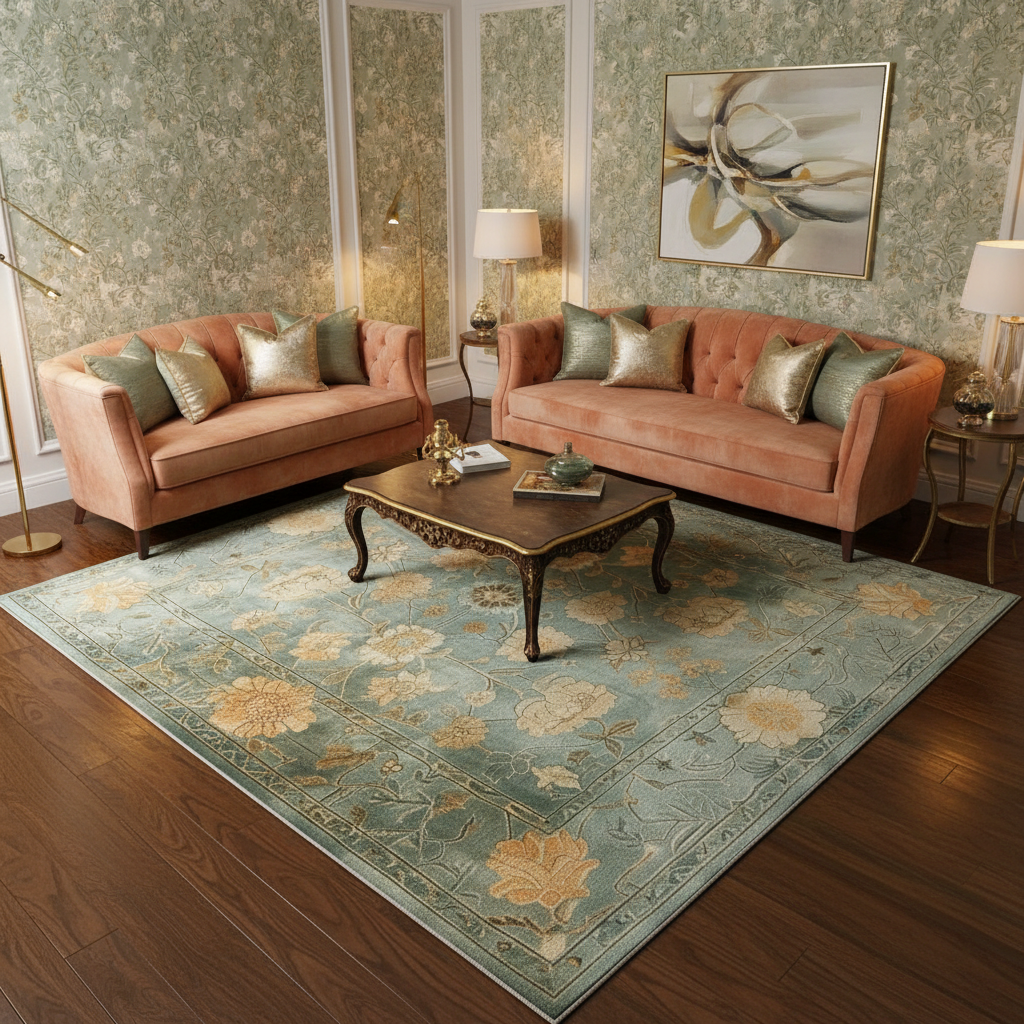 This exquisitely hand-tufted wool rug immerses your home in timeless elegance and understated luxury. Intricate floral patterns, woven in soft gold and teal, bring a sense of warmth and sophistication to any room. Transform your living space into a sanctuary of refined beauty with this exceptional piece.