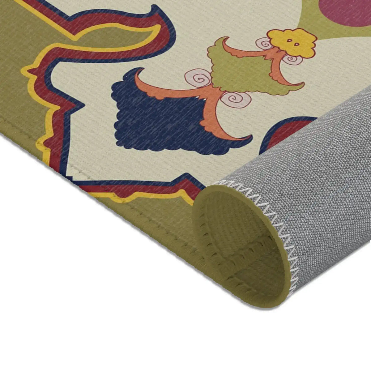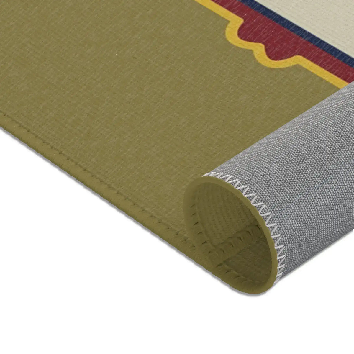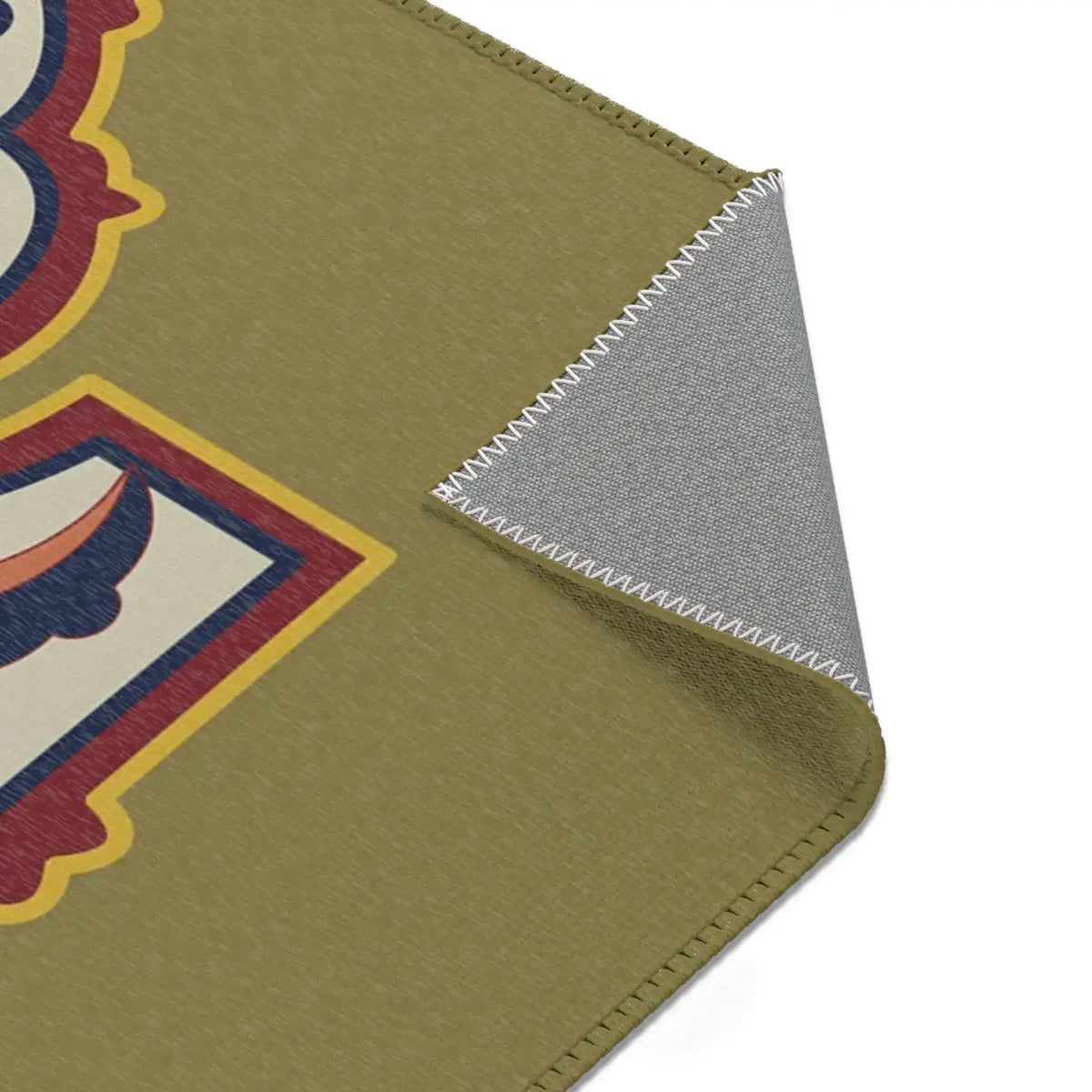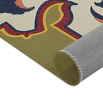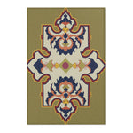 This accent rug features a bold, geometric sunburst design in black, red, and beige. The pattern radiates energy and vibrance, making it a striking addition to any room. The contrasting colors and dynamic shapes create a visually captivating piece that effortlessly enhances modern and artistic home decor.