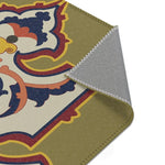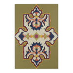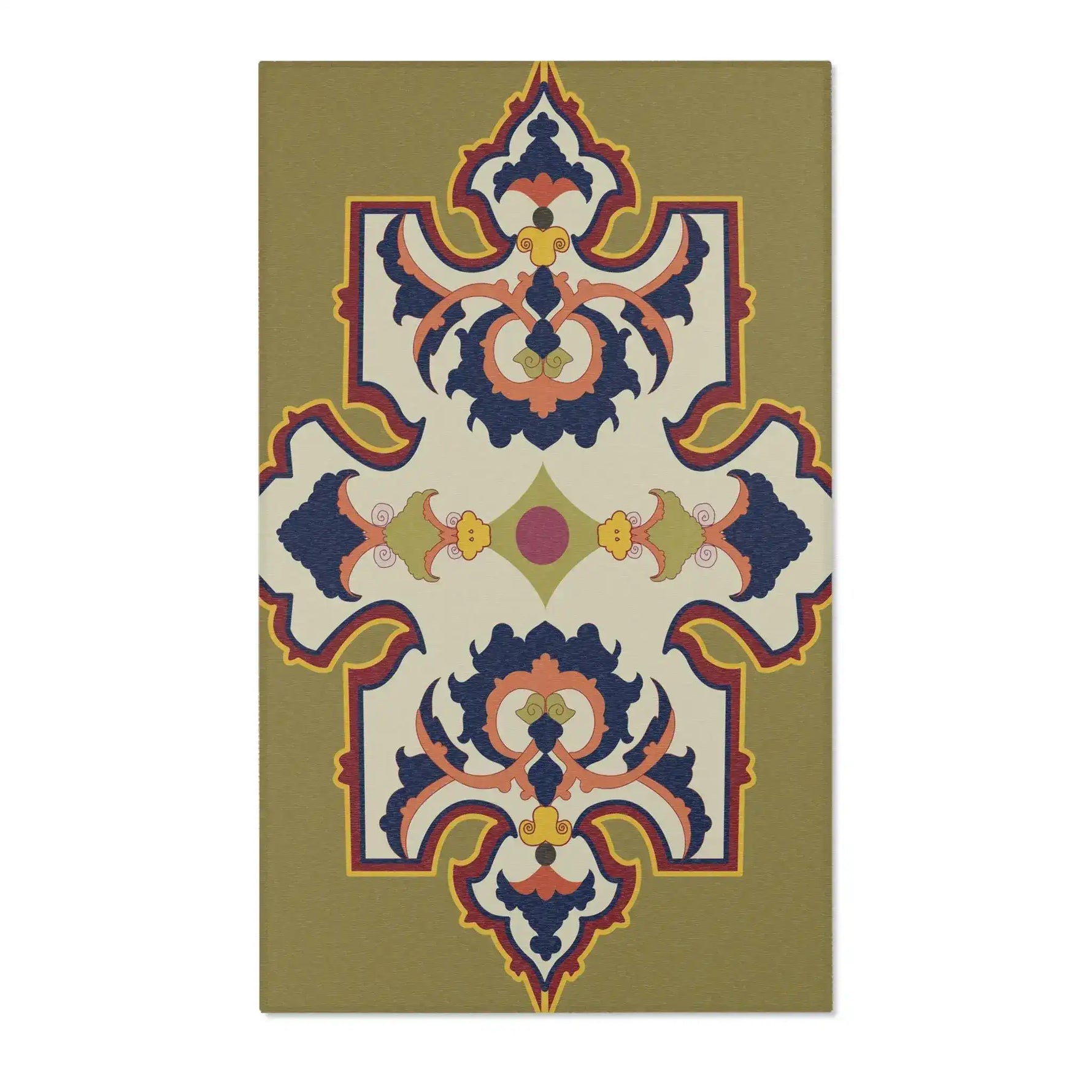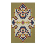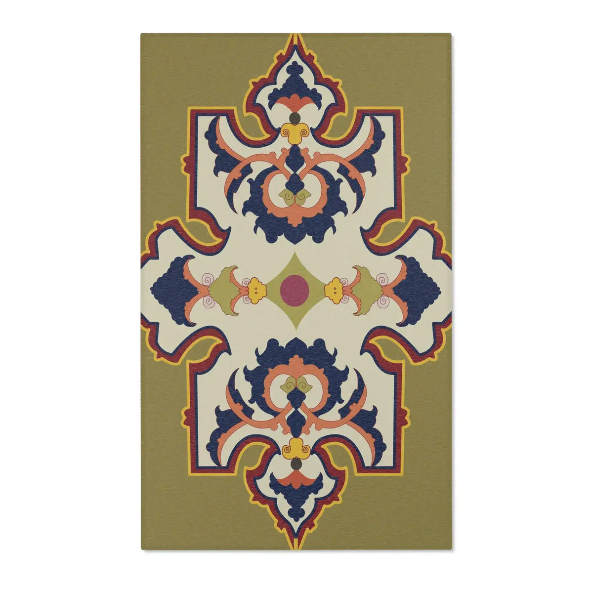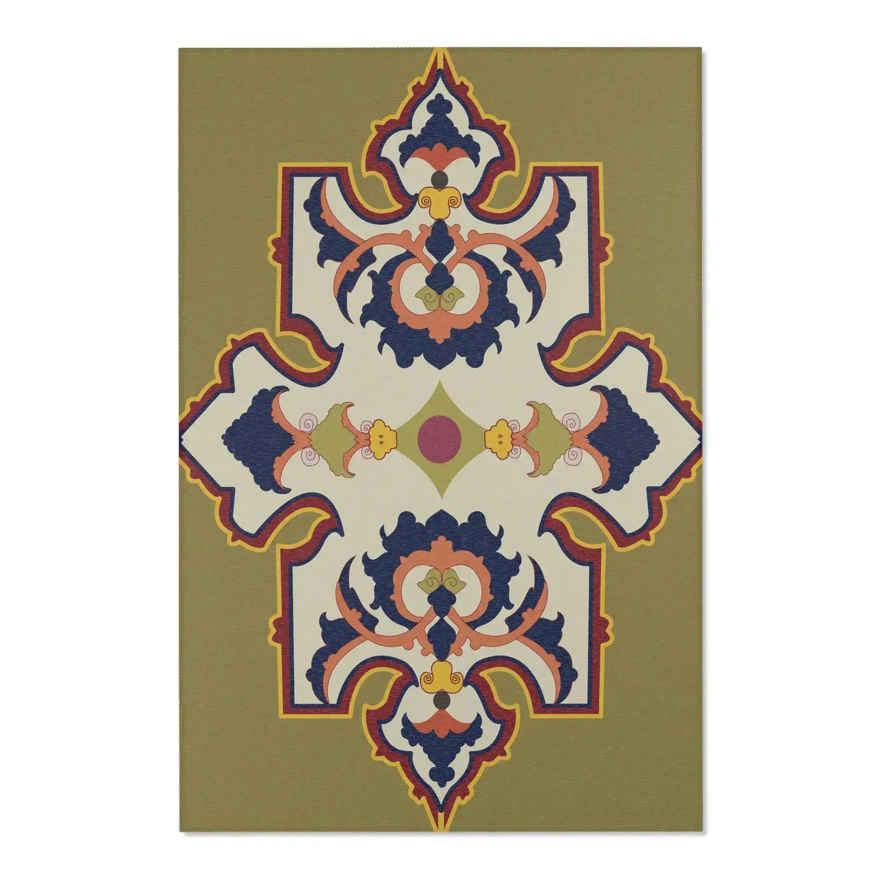 This accent rug features a bold, geometric sunburst design in black, red, and beige. The pattern radiates energy and vibrance, making it a striking addition to any room. The contrasting colors and dynamic shapes create a visually captivating piece that effortlessly enhances modern and artistic home decor.