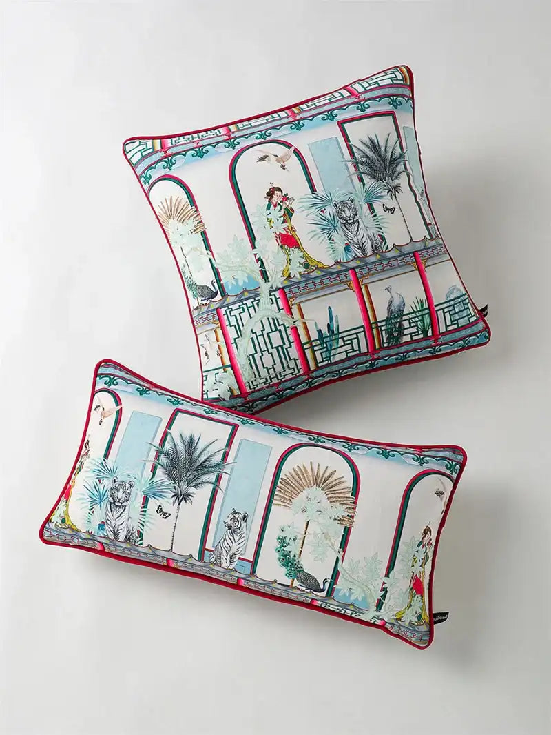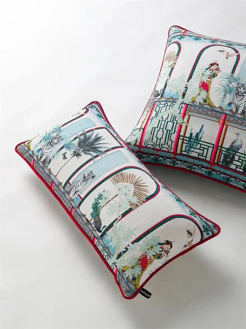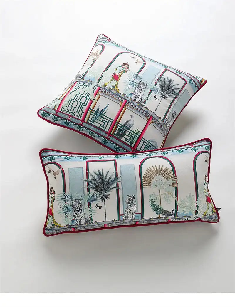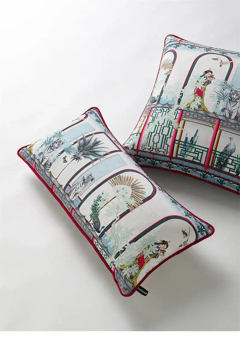 Elevate your décor with this luxury Chinoiserie cushion cover featuring majestic tigers, pavilion vase motifs, and oriental garden artistry. Crafted for a timeless vintage charm, it adds an exotic yet elegant touch to any living space.