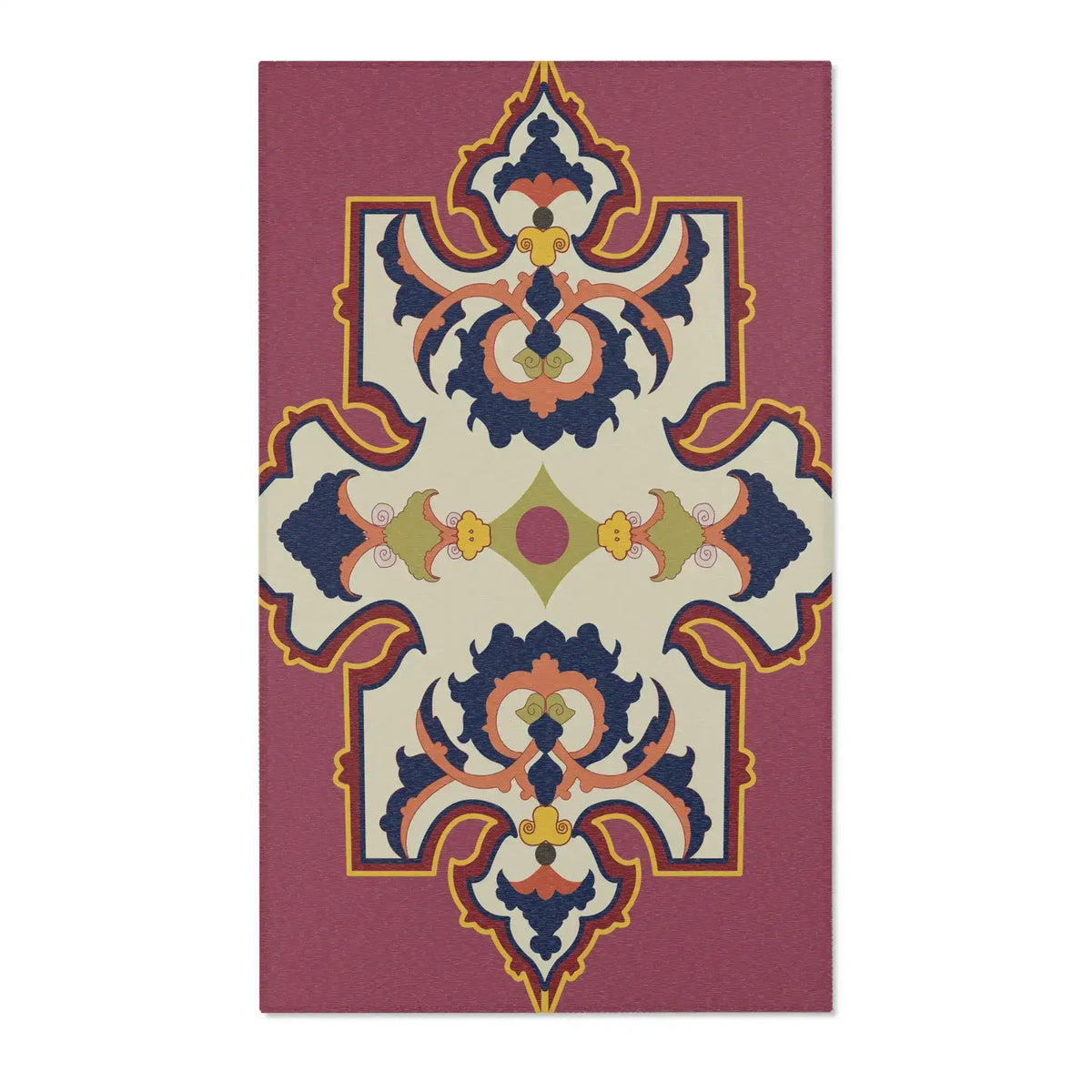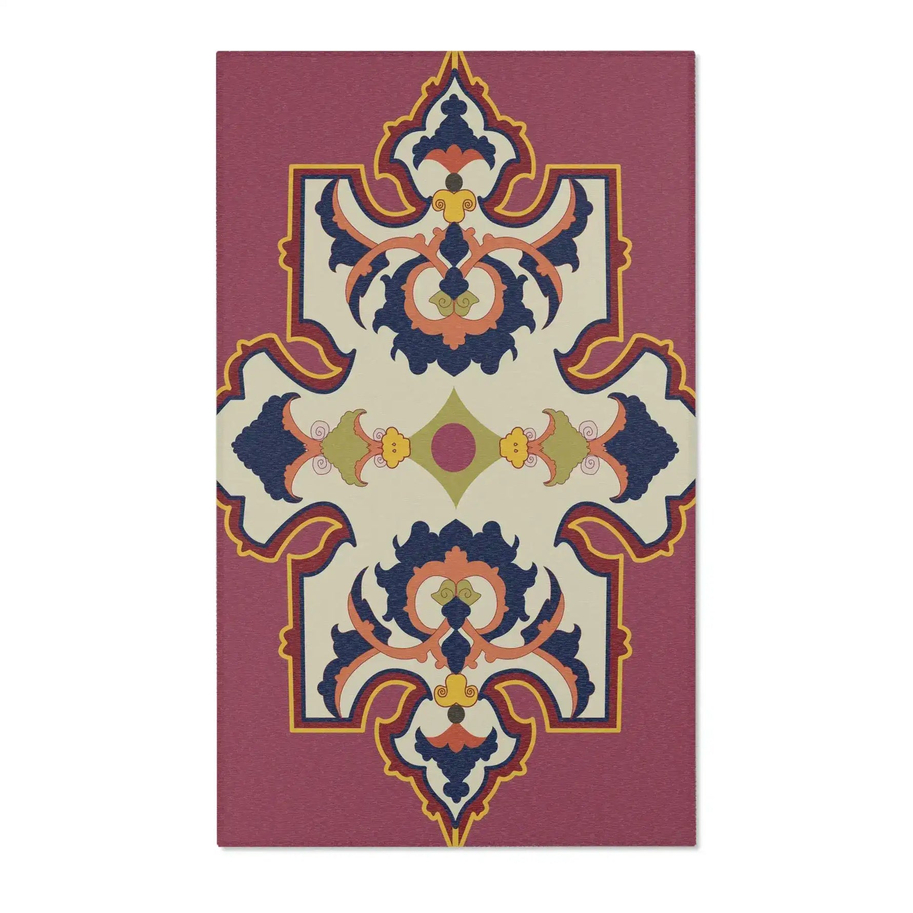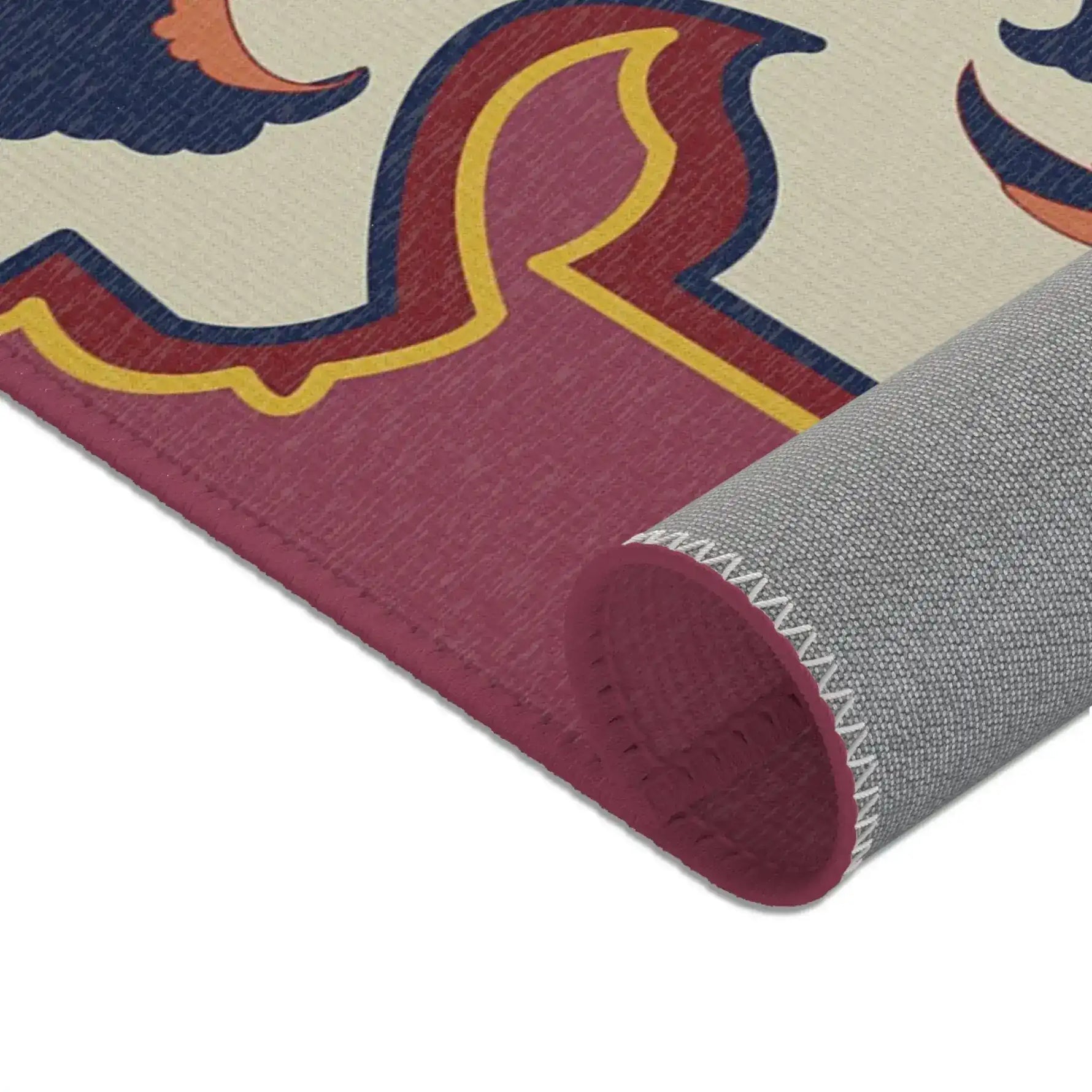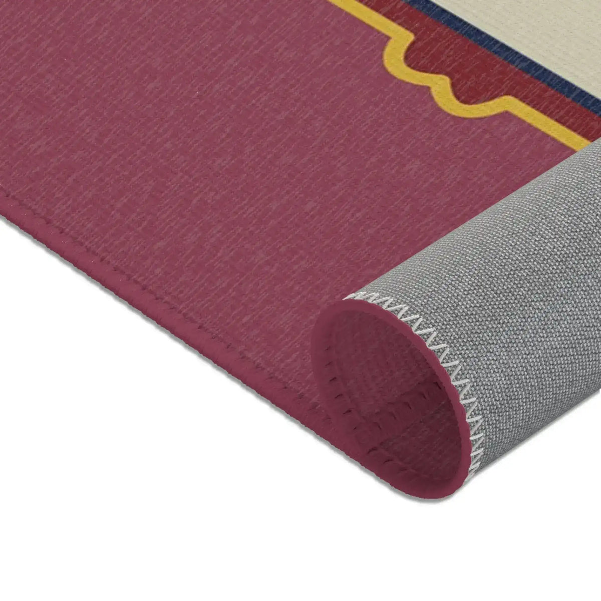 This accent rug features a bold, geometric sunburst design in black, red, and beige. The pattern radiates energy and vibrance, making it a striking addition to any room. The contrasting colors and dynamic shapes create a visually captivating piece that effortlessly enhances modern and artistic home decor.
