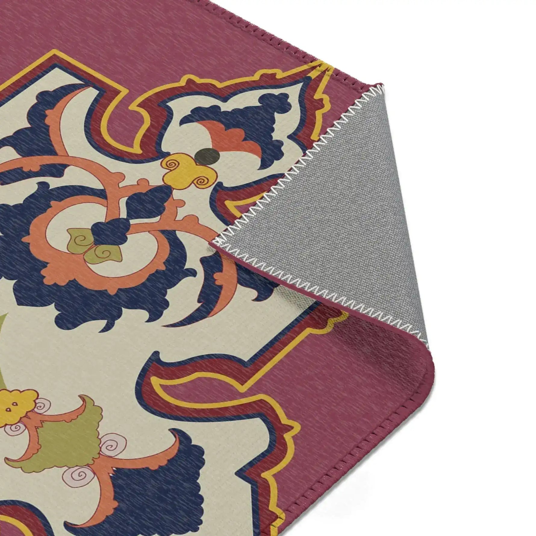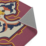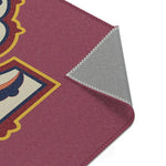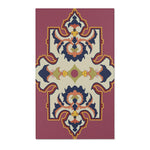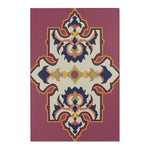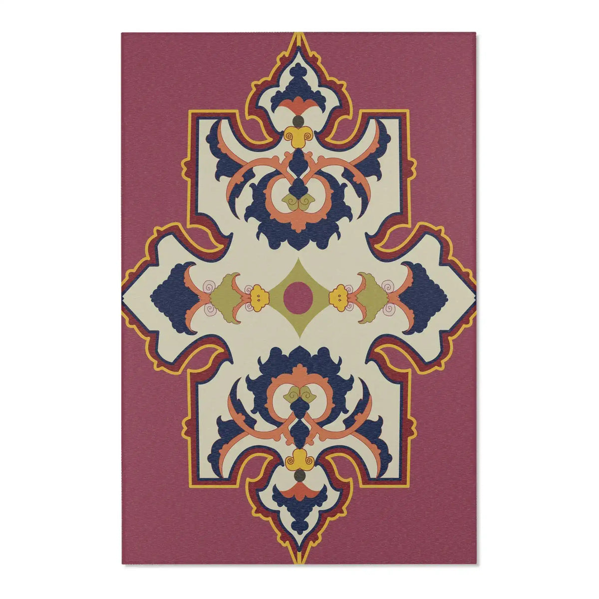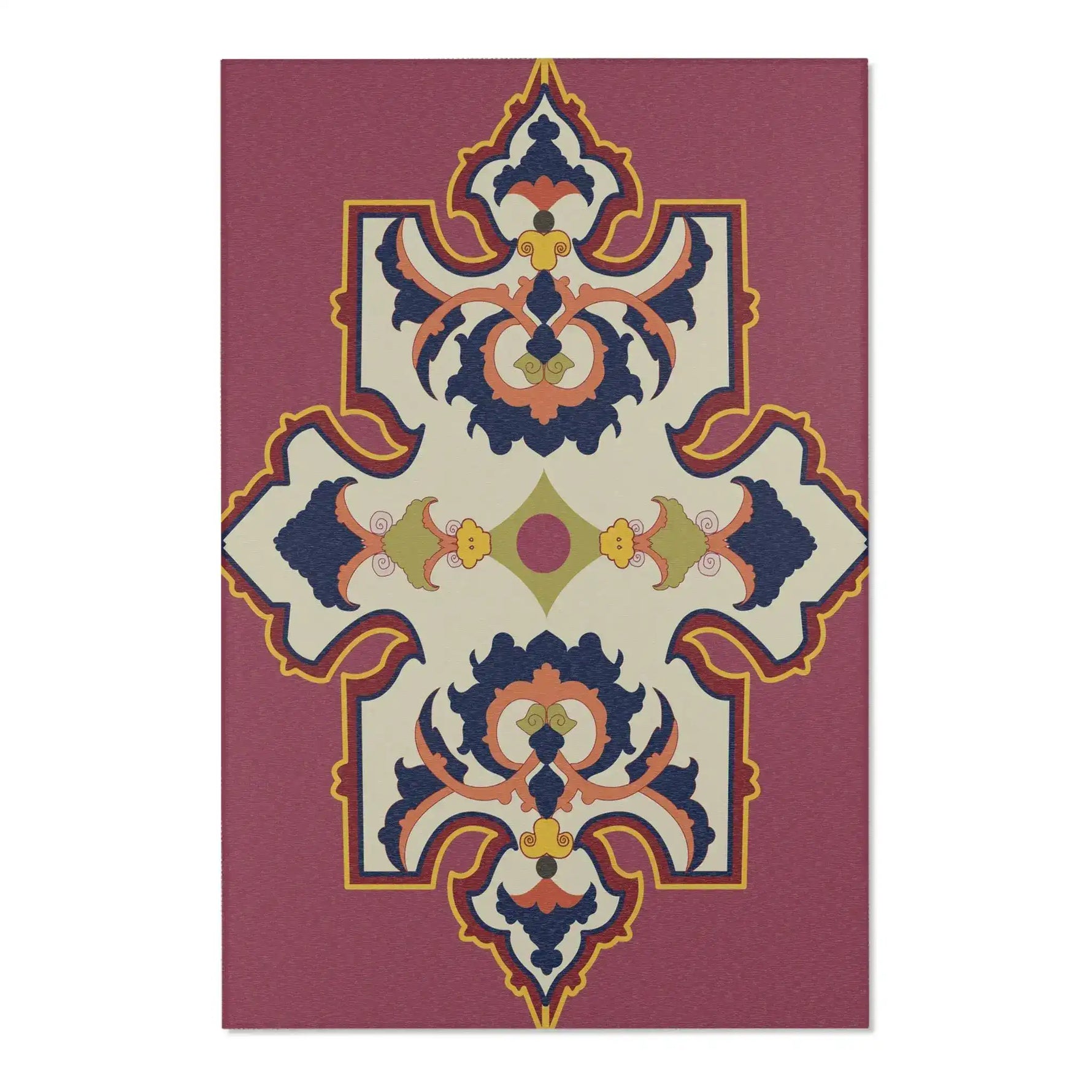 This accent rug features a bold, geometric sunburst design in black, red, and beige. The pattern radiates energy and vibrance, making it a striking addition to any room. The contrasting colors and dynamic shapes create a visually captivating piece that effortlessly enhances modern and artistic home decor.