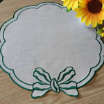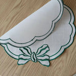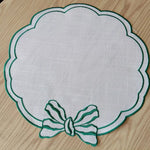 The Sage Green Placemat adds a touch of whimsical elegance to any tablescape. Made from 100% premium cotton, this handcrafted placemat features a delicate scalloped edge and a charming bow detail. The classic design and refined details elevate everyday meals and special occasions, bringing a sense of luxurious comfort and style to your home.