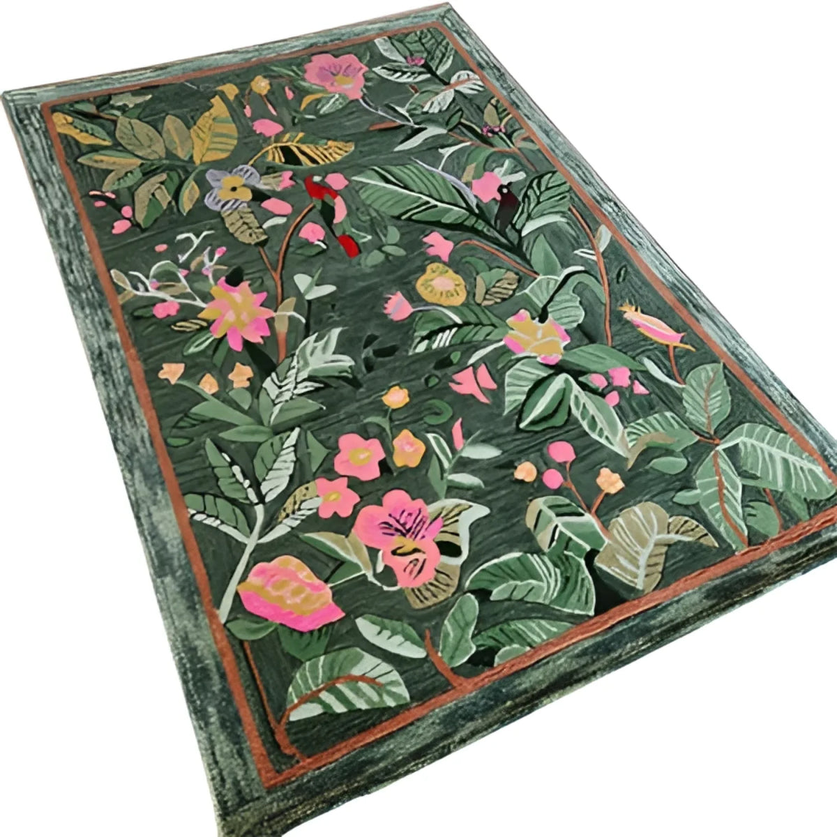 Putting the Tropical Treasure Hand Tufted Wool Rug on display. This bright rug will bring the lush, tropical beauty of the tropics into your home. The lovely patterns on this rug are based on animals and plants that live in the tropics. They will add color and life to your room. This rug is made by hand from high-quality wool and is very soft and durable, making it a great choice for making a warm and welcoming place.