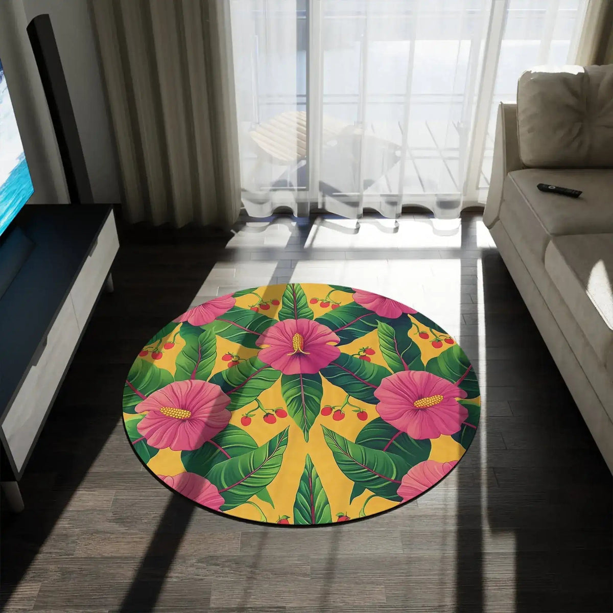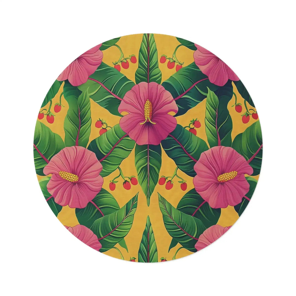 Vibrant Tropical Hibiscus and Cherry Floral Round Rug